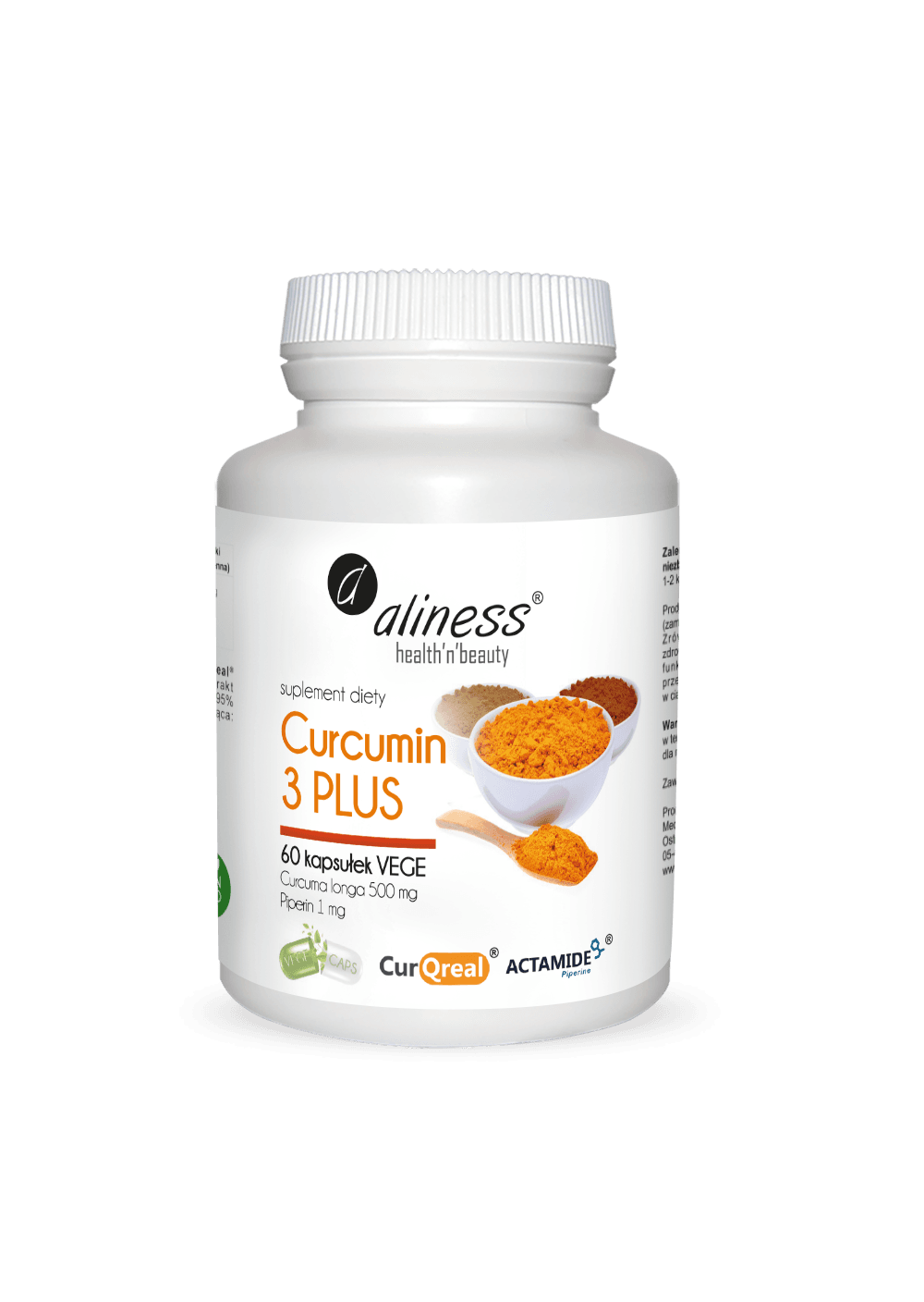 Aliness Curcumin 3 PLUS to kompozycja w 100% naturalnych kurkuminoidów, w postaci opatentowanego ekstraktu z kurkumy CurQreal®. W skład kompleksu wchodzą trzy związki chemiczne występujące naturalnie w kurkumie: kurkumina, desmetoksykurkumina (DMC) i bis-desmetoksykurkumina (BDMC). Aby zwiększyć biodostępność kurkuminoidów, skład wzbogacono o naturalny ekstrakt z pieprzu ACTAMIDE®, który zawiera 95% piperyny i jest pozyskiwany wyłącznie na drodze wodnej ekstrakcji.