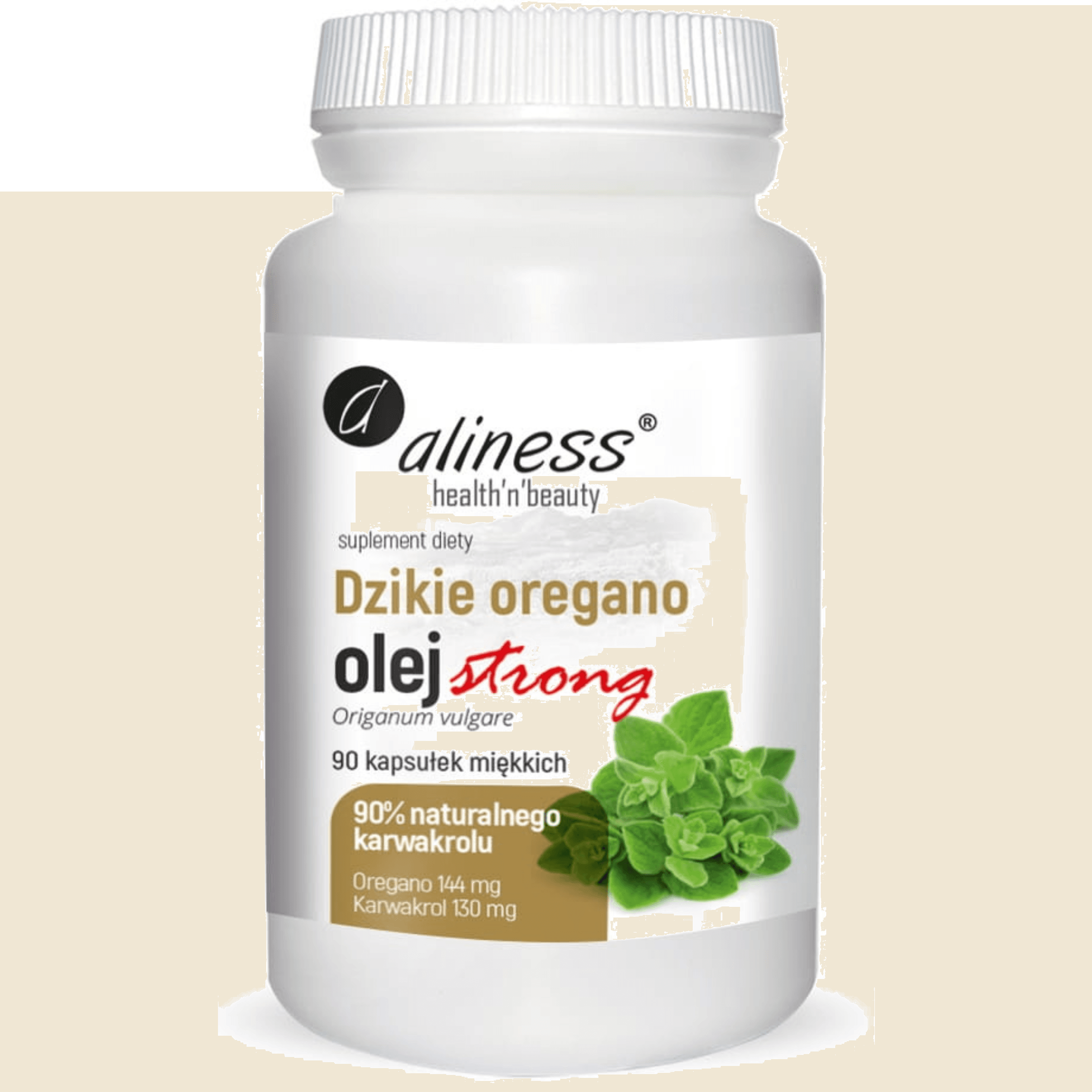 Aliness Dzikie Oregano Olej Strong to w 100% naturalny olej z oregano o wysokiej zawartości 90% karwakrolu. Produkt zawiera wyłącznie naturalny karwakrol, a tak wysokie stężenie uzyskano dzięki zastosowaniu jedynie fizycznego procesu rektyfikacji, czyli frakcjonowania w oparciu o względną lotność składników oraz dzięki wykorzystaniu odpowiednich części najwyższej jakości roślin. Podczas produkcji nie są używane żadne.