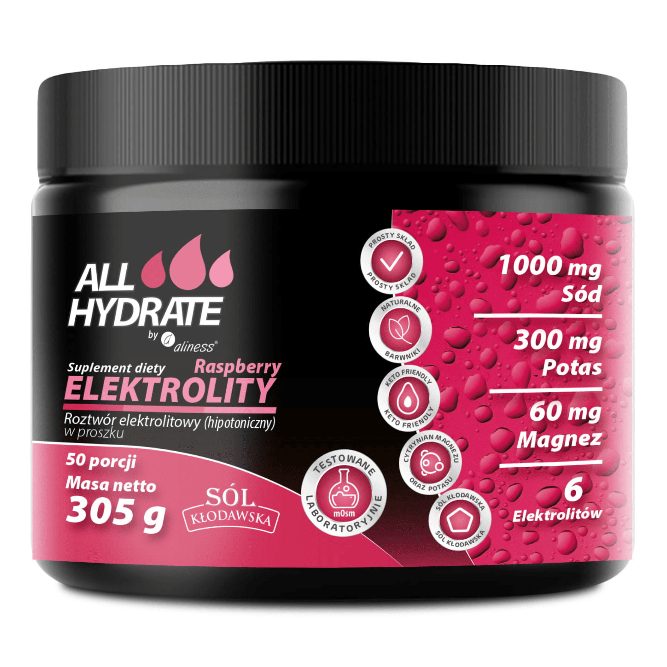 ALLHydrate, Elektrolity Raspberry 305g, 50 porcji
