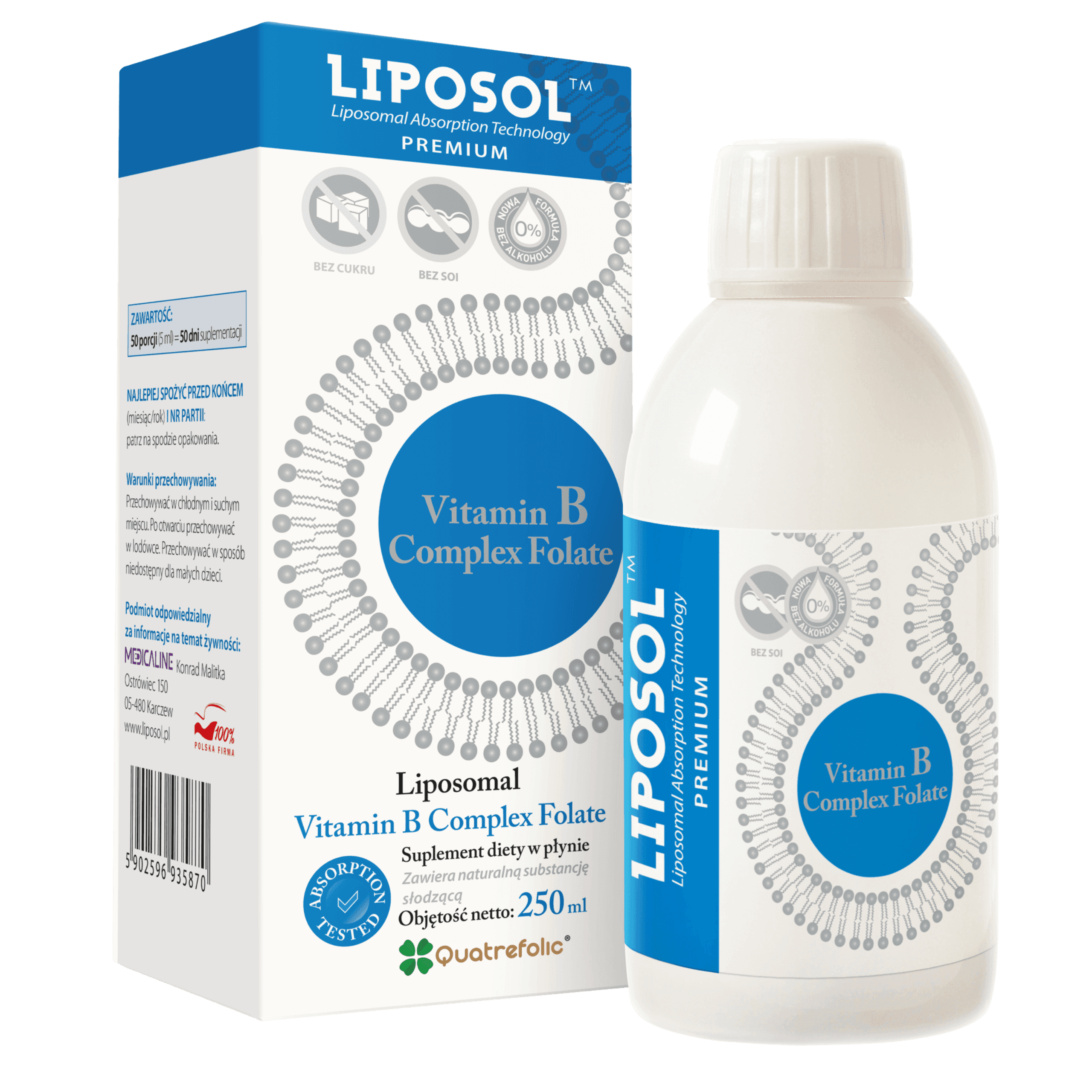 Liposol B Complex Folate 100%TM został zamknięty w liposomach. Liposomy są małymi cząsteczkami (kuleczkami) lipidowymi, które powstają naturalnie w momencie kontaktu wody z lecytyną, składnikiem soi niemodyfikowanej genetycznie. Liposomy są łatwo wchłaniane przez organizm. Gdy witaminy rozpuszczą się w wodzie i miesza z lecytyną zachodzi proces enkapsulacji liposomalnej. Rezultatem jest lepsze wchłanianie witamin we krwi i bezpośrednio do ścian komórkowych.