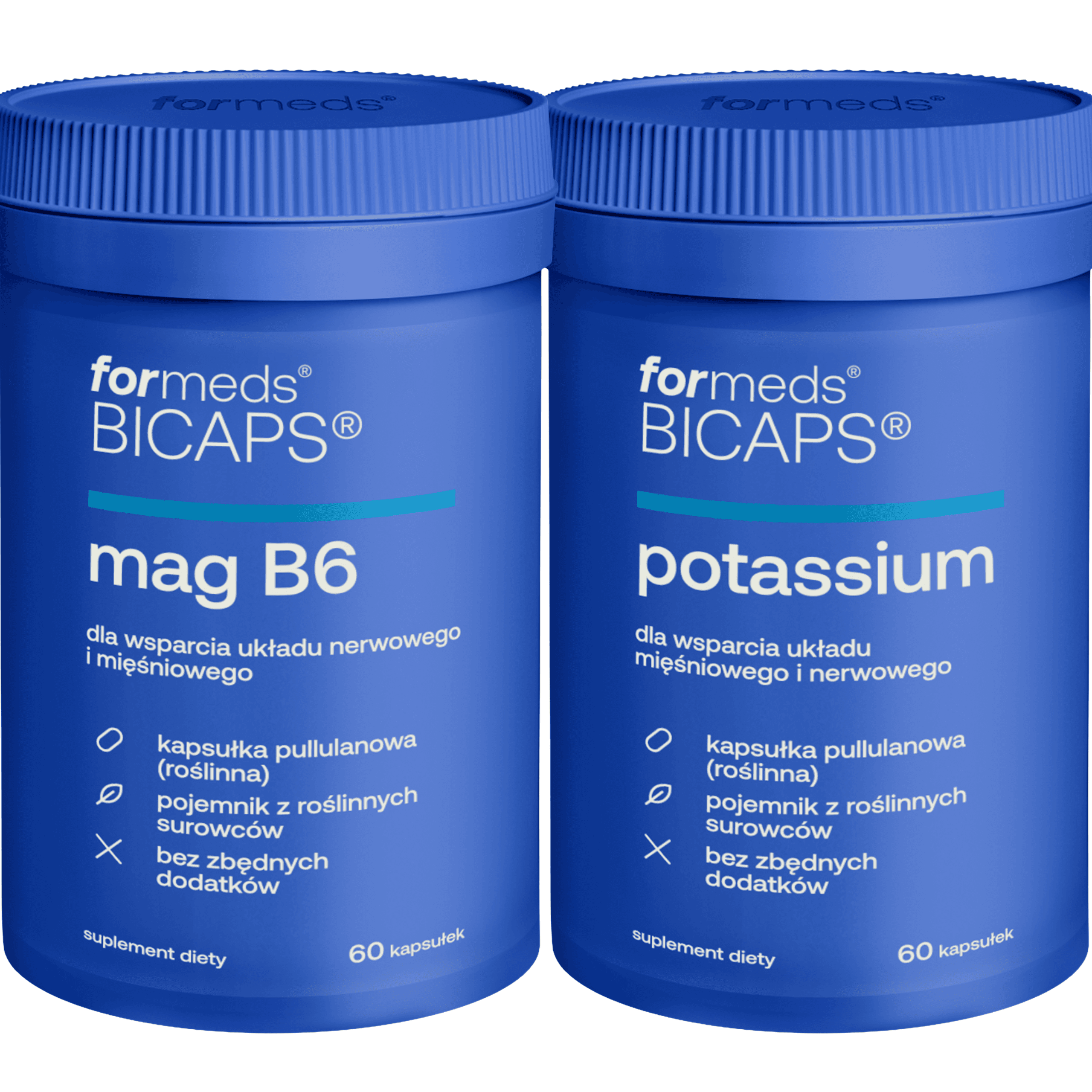Suplementy diety poznańskiej marki formeds. Magnez Potas B6 to formeds BICAPS mag B6 oraz formeds BICAPS pottasium. Preparaty bez zbędnych dodatków i wypełniaczy. Dodatkowo zamknięte w roślinnej kapsułce co pozwala na ich stosowanie przez wegan.