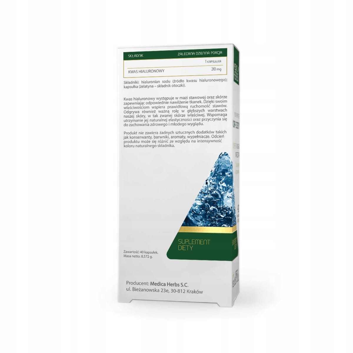 Składniki: hialuronian sodu (źródło kwasu hialuronowego); kapsułka (żelatyna – składnik otoczki).